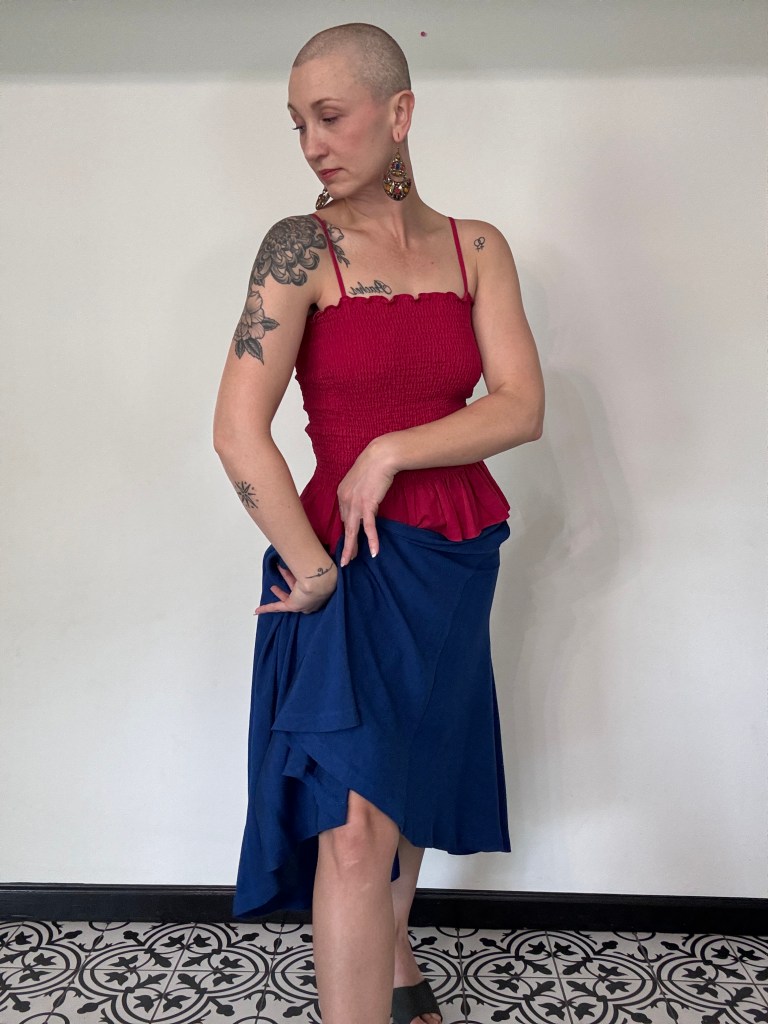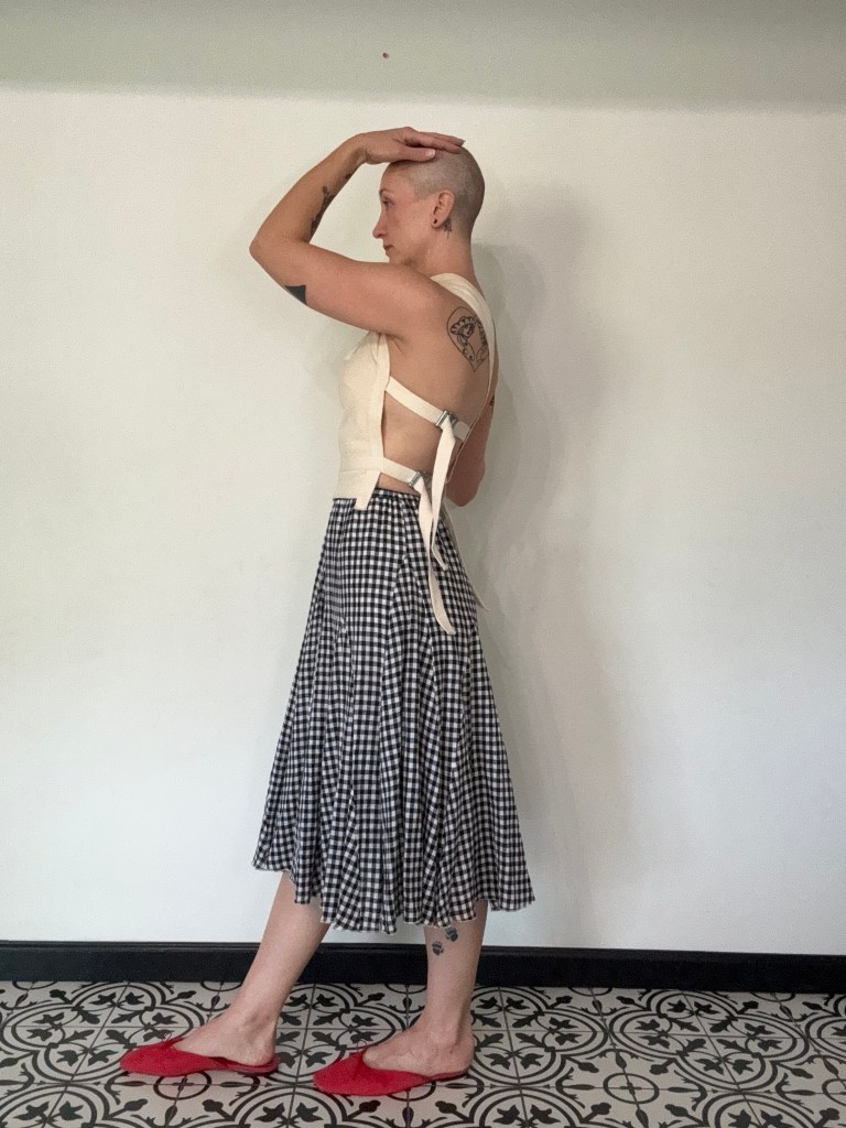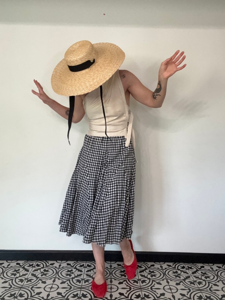 In this look, I’m wearing a flowy gingham skirt made of cotton—a classic pattern and an ideal fabric choice for warm weather. The top is a piece I made myself from reclaimed denim, giving it that structured look while still being breathable thanks to its cropped silhouette.