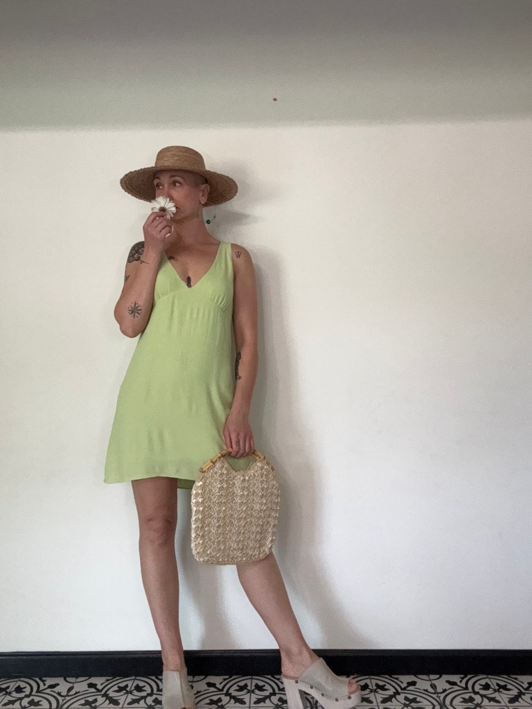 The sundress I’m wearing here is a thrifted piece made of viscose, which makes it lightweight and breathable—perfect for steamy summer days. While looking closely at the tag today, I noticed the lining is made from Lenzing Ecovero, which I discovered is an eco-friendlier version of viscose. It uses less water in its production and is processed in a closed-loop system, making it a much better choice for the planet.